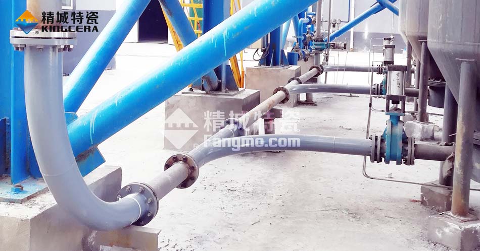 復(fù)合陶瓷管磨損嚴(yán)重的工況,而且部分已經(jīng)打了背包,經(jīng)研究發(fā)現(xiàn)復(fù)合陶瓷的微觀裂紋多,質(zhì)脆易碎,容易局部脫落失效,而且脫落后無(wú)法修補(bǔ)。后來(lái)結(jié)合我們老廠使用精城牌耐磨陶瓷管道的經(jīng)驗(yàn),采用氧化鋁陶瓷,氧化鋁陶瓷貼片的氧化鋁含量≥95%,而且全部是高溫相a-Al?O?,燒結(jié)溫度高達(dá)1670℃,確保材料的品質(zhì)。從以往耐磨陶瓷管道實(shí)際的磨損情況來(lái)看,內(nèi)襯耐磨陶瓷的管道使用壽命是離心澆筑復(fù)合陶瓷管的5倍以上。所以特邀請(qǐng)湖南精城特瓷的專(zhuān)家團(tuán)隊(duì)到我司來(lái)現(xiàn)場(chǎng)勘察,解決輸灰管道易磨損的難題。