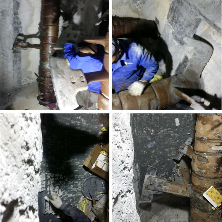 耐磨陶瓷襯板設(shè)計(jì)使用壽命3年或產(chǎn)量達(dá)60萬方,而實(shí)際使用壽命達(dá)到4年產(chǎn)出量約80萬方,耐磨性能及產(chǎn)量輸出遠(yuǎn)超實(shí)際設(shè)計(jì)磨損。這次修復(fù)主要針對磨損嚴(yán)重及其損壞部件,精城公司安裝隊(duì)結(jié)合多年的應(yīng)用經(jīng)驗(yàn)及企業(yè)自身的加工優(yōu)勢,使用精細(xì)工藝與耐磨材料相結(jié)合的修復(fù)方案。即采用高耐磨精細(xì)氧化鋁陶瓷加超強(qiáng)陶瓷金屬粘合劑在攪拌機(jī)內(nèi)重新打磨粘貼,對磨損嚴(yán)重部位重新加工加固,缺損部位及磨損區(qū)域全部更換陶瓷襯板,力保滿足使用要求。