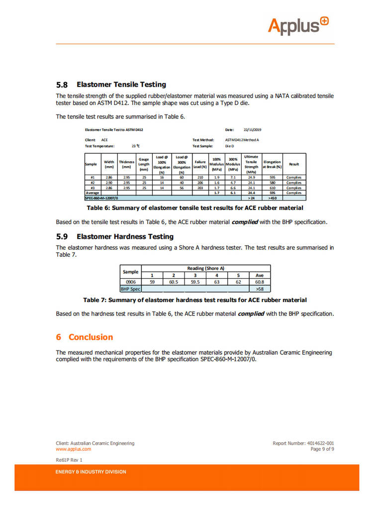 應(yīng)澳大利亞必和必拓鐵礦公司要求,澳大利亞國際測(cè)試機(jī)構(gòu)協(xié)會(huì)對(duì)湖南精城特種陶瓷有限公司生產(chǎn)的橡膠拉伸強(qiáng)度和硬度進(jìn)形測(cè)試,該測(cè)試基于ASTM D412標(biāo)準(zhǔn)。經(jīng)測(cè)試,精城特瓷的橡膠性能完全符合甚至超過必和必拓鐵礦公司對(duì)耐磨